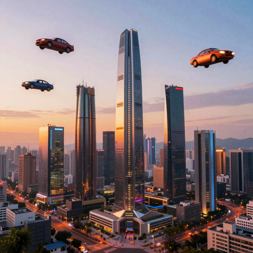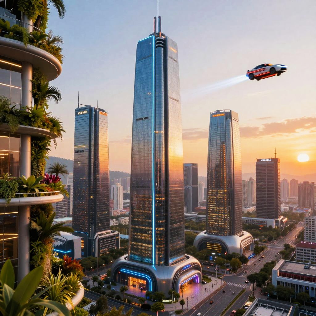 Beautiful futuristic city at sunset, gleaming skyscrapers with neon lights, flying cars zooming through the sky, lush vertical gardens, and advanced technology visible everywhere, ultra-detailed