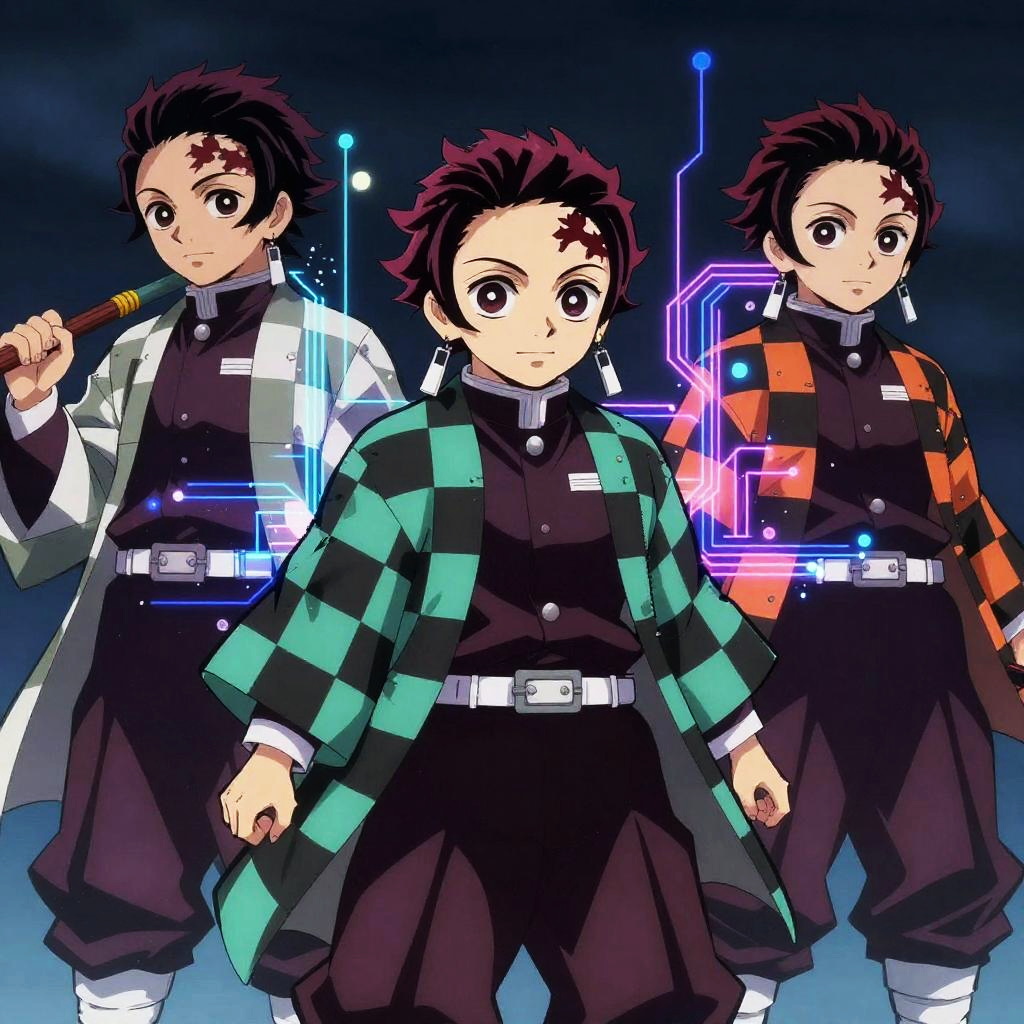 Demon Slayer Generator depicting a group of demon slayers standing united on a cliff during a thunderstorm, their weapons glowing with elemental powers, dark clouds swirling above, vivid rain effects, epic fantasy illustration with dynamic composition.