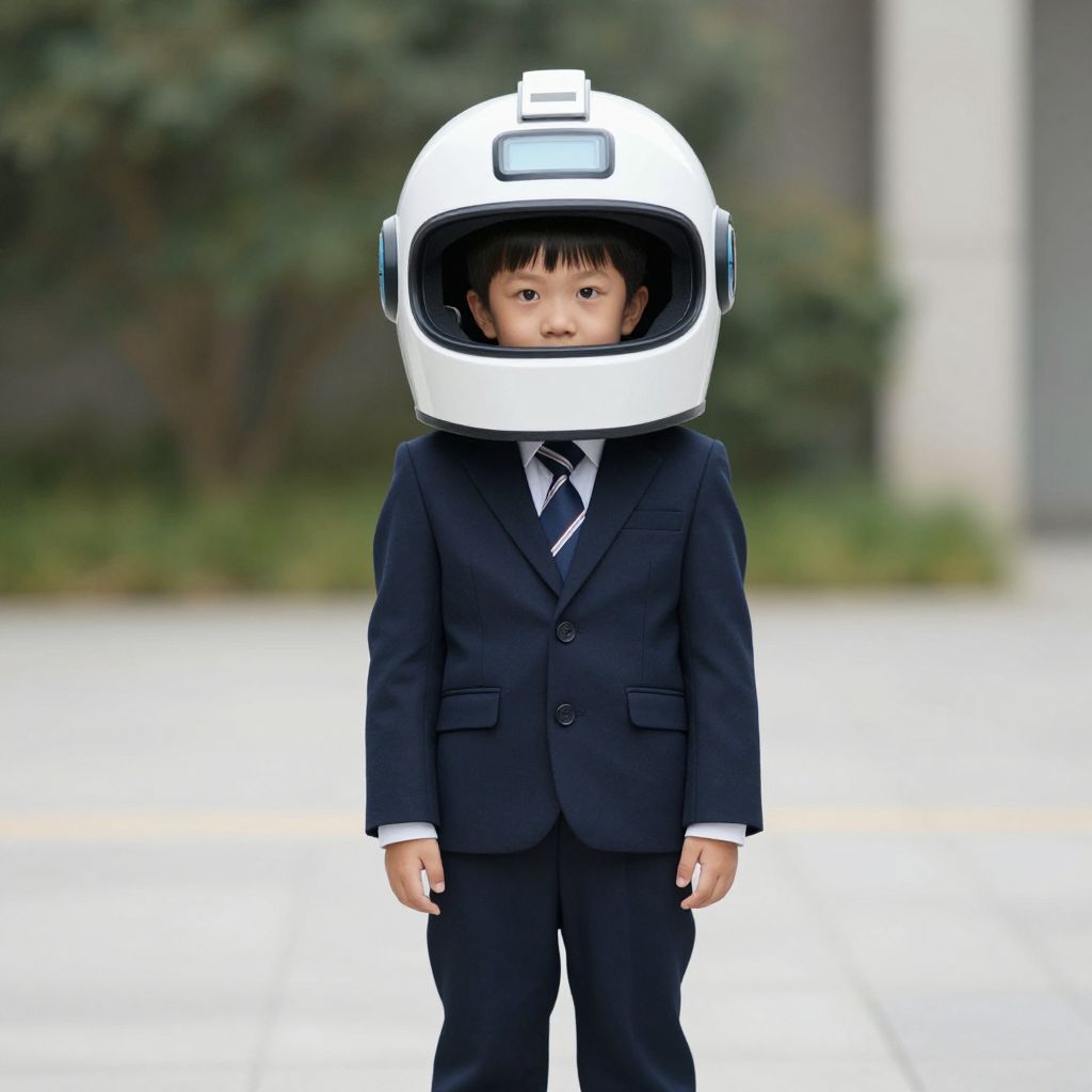 Photograph of an Asian toddler with short black hair, wearing a black suit, white dress shirt, and striped tie. The child is standing outdoors on a concrete path, with a blurred background of green bushes and a gray building. The toddler is wearing a white, futuristic motorcycle helmet with a small rectangular light on top. The helmet is oversized, covering most of the child's face, except for their curious, wide-eyed expression. The overall image has a surreal, whimsical feel due to the child's attire and helmet combination.