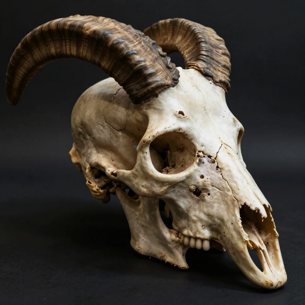 Ram skull side profile, intricate details of bone texture and curved horns, set against a dark, moody background, high contrast lighting emphasizing the rugged shape, realistic yet artistic with a mystical vibe, hyper-detailed close-up