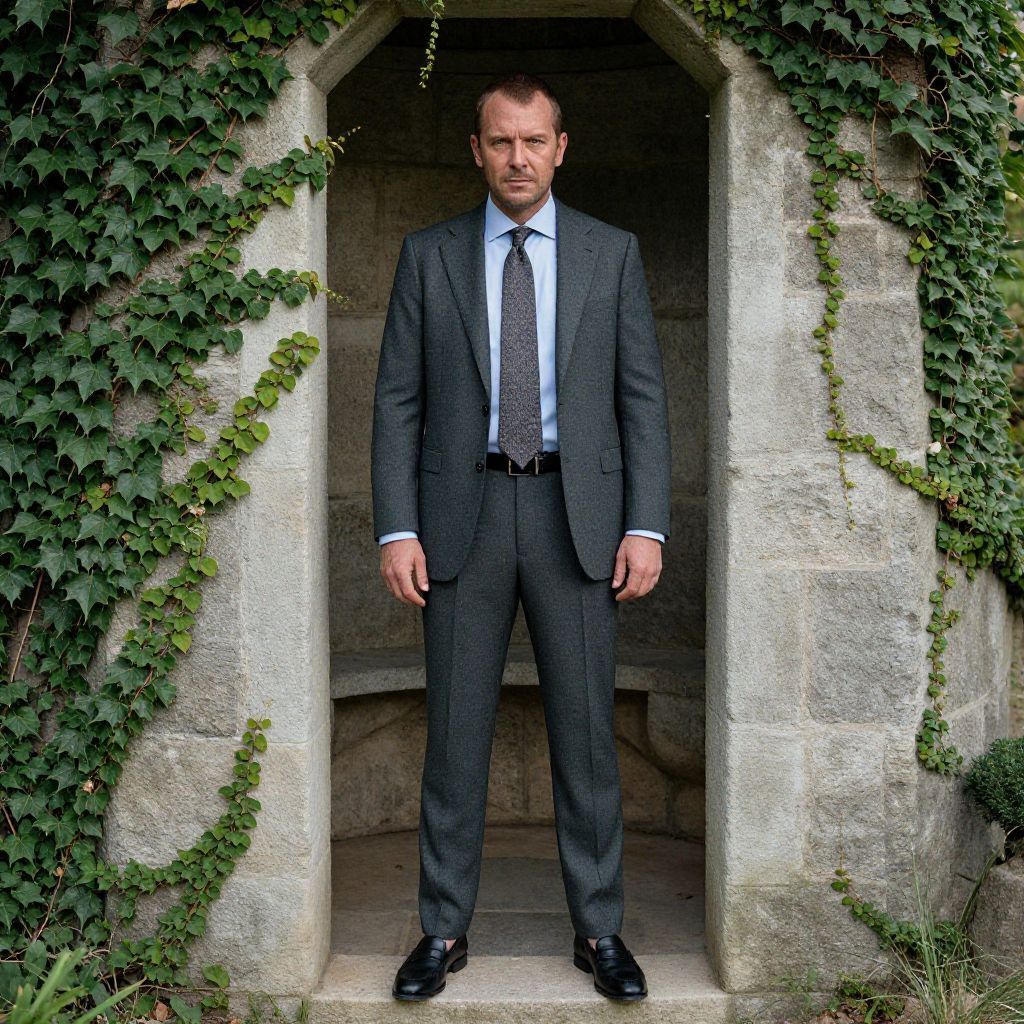 Portrait of a man with a masculine face and piercing eyes wearing a charcoal gray tailored suit, light blue dress shirt, patterned silk tie, black leather loafers, and a sleek black leather belt. He stands confidently in a quaint stone structure with ivy-covered walls. The image has a lithographic film style appearance.