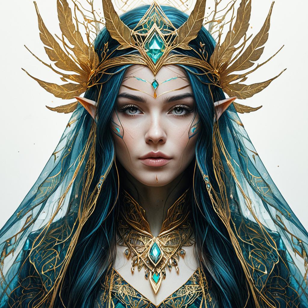 Portrait of a mysterious sorceress, with long hair, intricate gold linings, and a veil, inspired by Minjae Lee, Carne Griffiths, and Emily Kell, featuring crescent moon motifs, soft glowing auras, deeply detailed and balanced with double exposure, photorealism, and ultra-realistic textures in an upper-body shot (facing viewer).