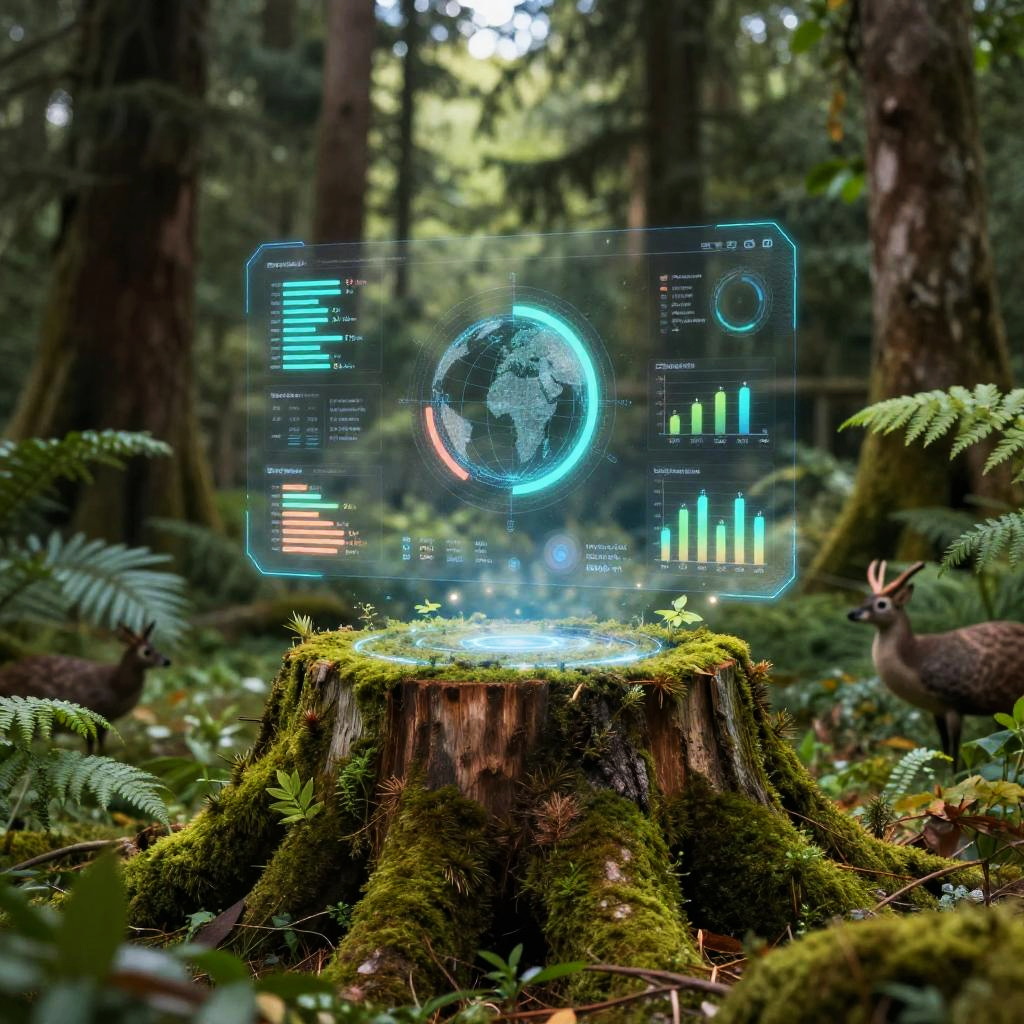 Forest AI as an ethereal holographic interface floating above a moss-covered tree stump, showcasing data streams and forest health metrics, surrounded by diverse flora and fauna, highlighting the fusion of artificial intelligence and natural environment conservation.