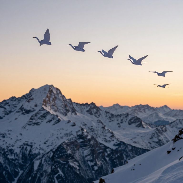 Origami cranes soar gracefully above jagged snow-covered peaks, their translucent wings catching the soft light of the setting sun as they fly in harmonious formation toward an unseen horizon.