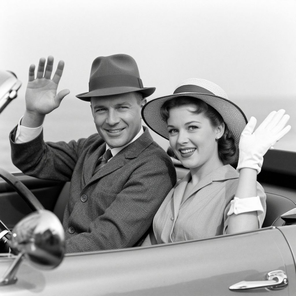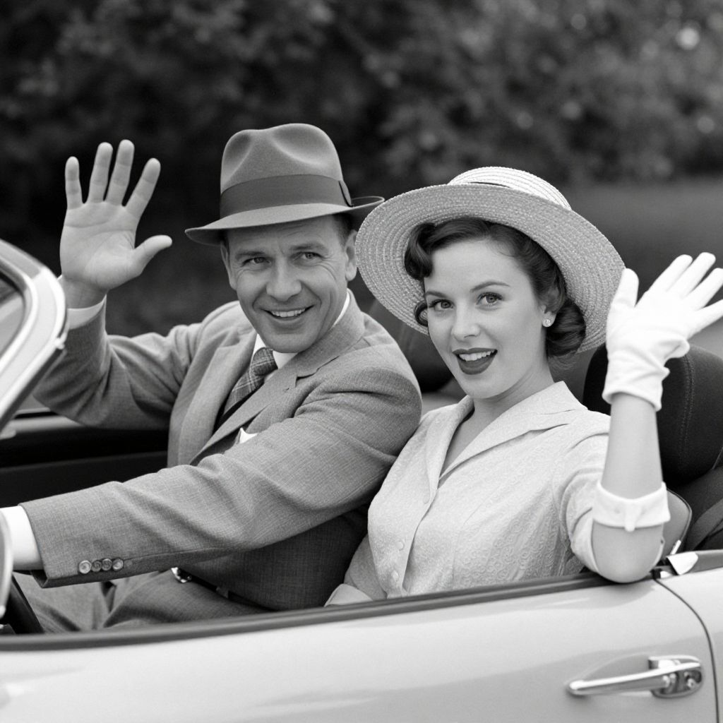 Black-and-white photograph of a smiling couple waving from a vintage car. The man, wearing a fedora and light-colored suit, is on the left, raising his right hand. The woman, on the right, has a wide-brimmed hat, white gloves, and a light-colored blouse. Both have mid-20th century style, with the woman's hair neatly curled. The car's interior is visible, with a dark leather seat. The background is blurred, suggesting an outdoor setting with trees. The image has a classic, nostalgic feel, emphasizing their cheerful expressions and coordinated waving gestures.