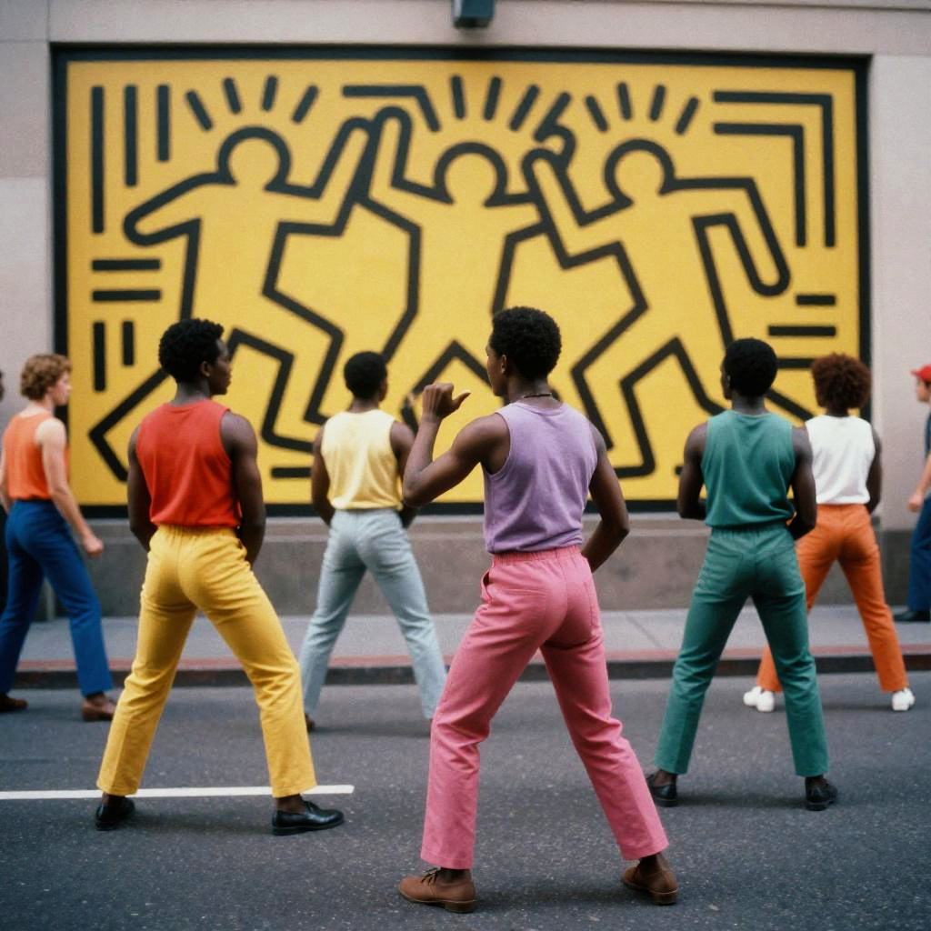 Vibrant colored street dancers, in an Anscochrome analog film style, cinematic and retro, grainy texture, dynamic composition, art by Keith Haring