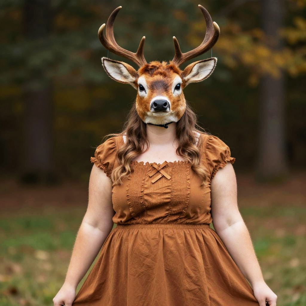 Plus Size Deer Halloween, a woman in a brown dress with a deer head on her head