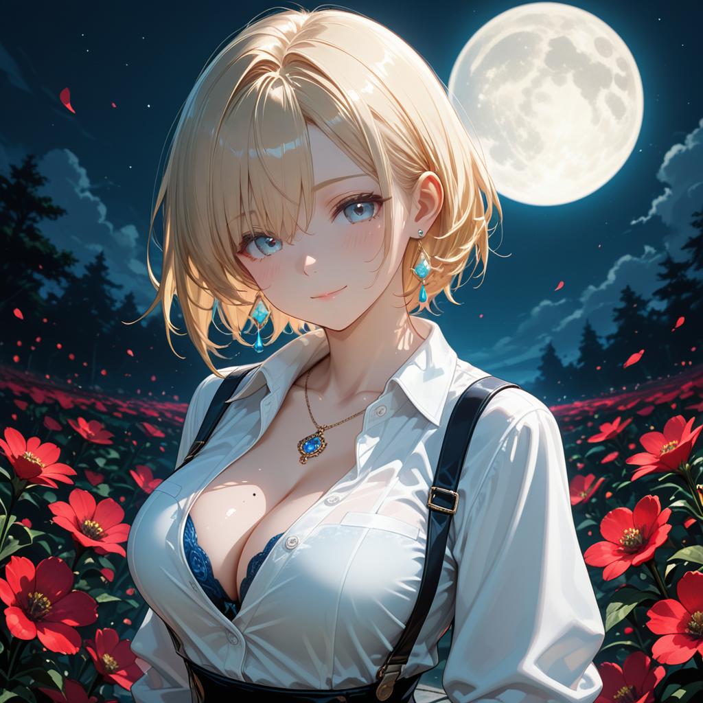 Digital illustration of a blonde woman with short hair and blue eyes standing outdoors at night in a field of red flowers. She wears a partially unbuttoned white shirt revealing a blue lace bra, high-waist pants with black suspenders, and blue gemstone earrings and necklace. A full moon and starry sky illuminate the scene, highlighting her gentle smile and a distinctive mole on her breast.