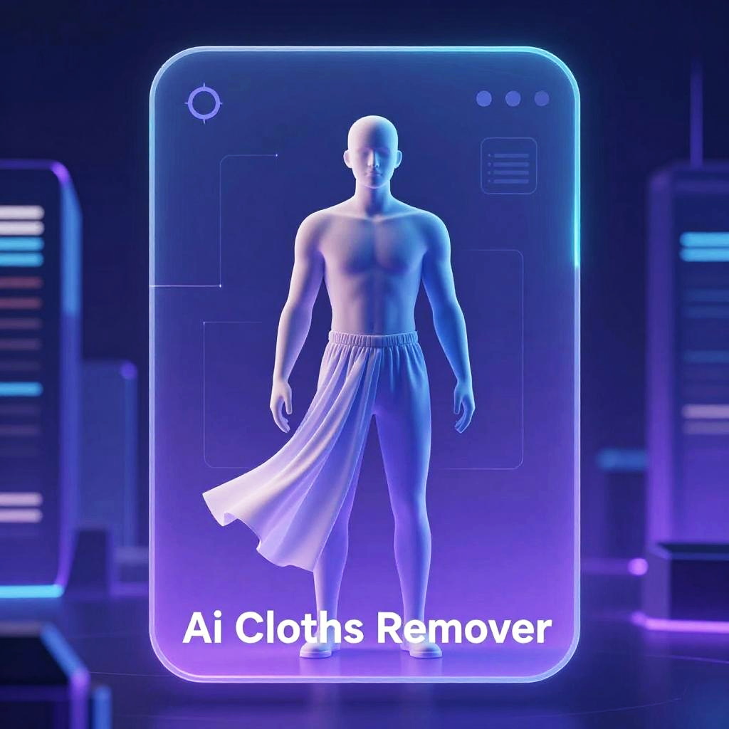Ai clothes remover app futuristic interface with digital clothes peeling away from human figure, sleek holographic display, neon blue and purple color scheme, high-tech urban background, smooth gradients, sci-fi style, detailed UI elements