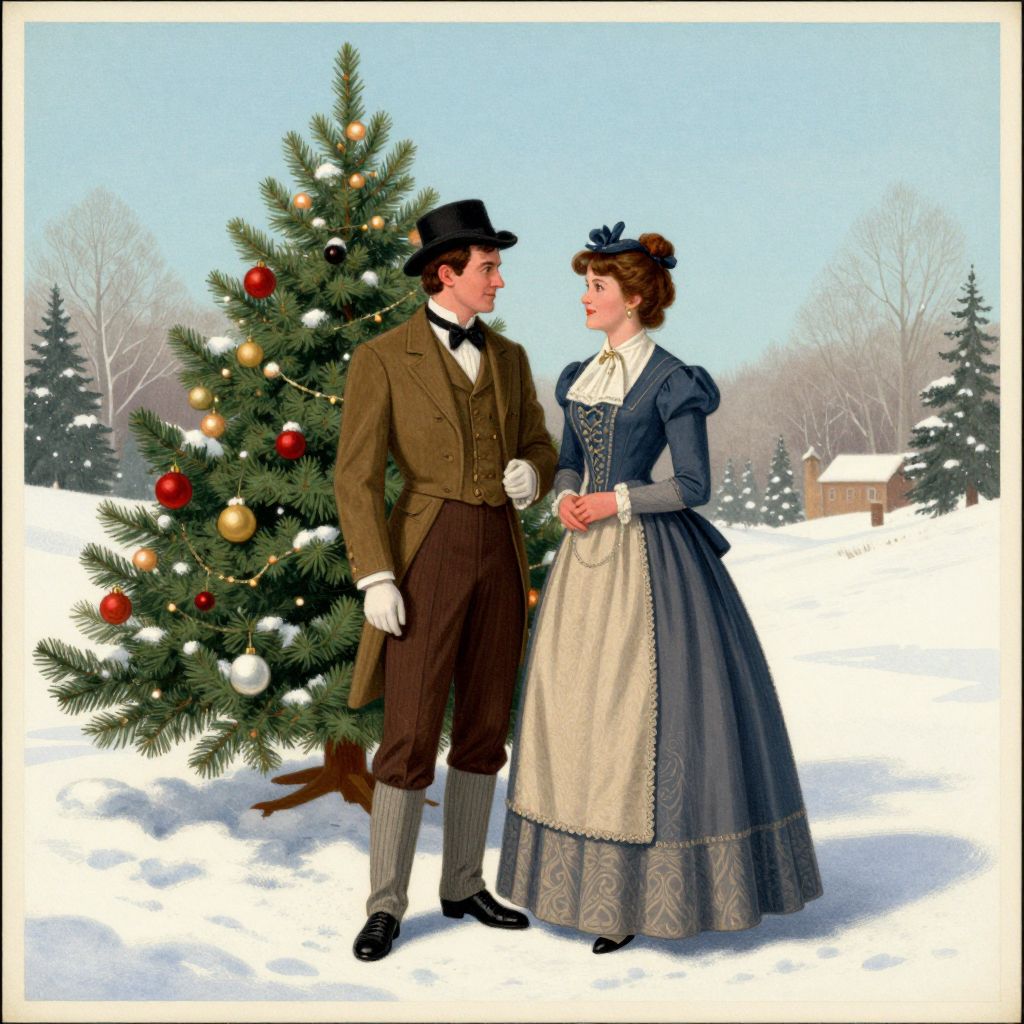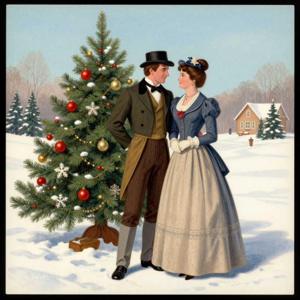 A vintage-style digital illustration reminiscent of 19th-century posters, featuring a man and woman dressed in elegant period attire, standing beside a festively decorated Christmas tree in a snowy landscape, evoking the charm of traditional American holiday cards.