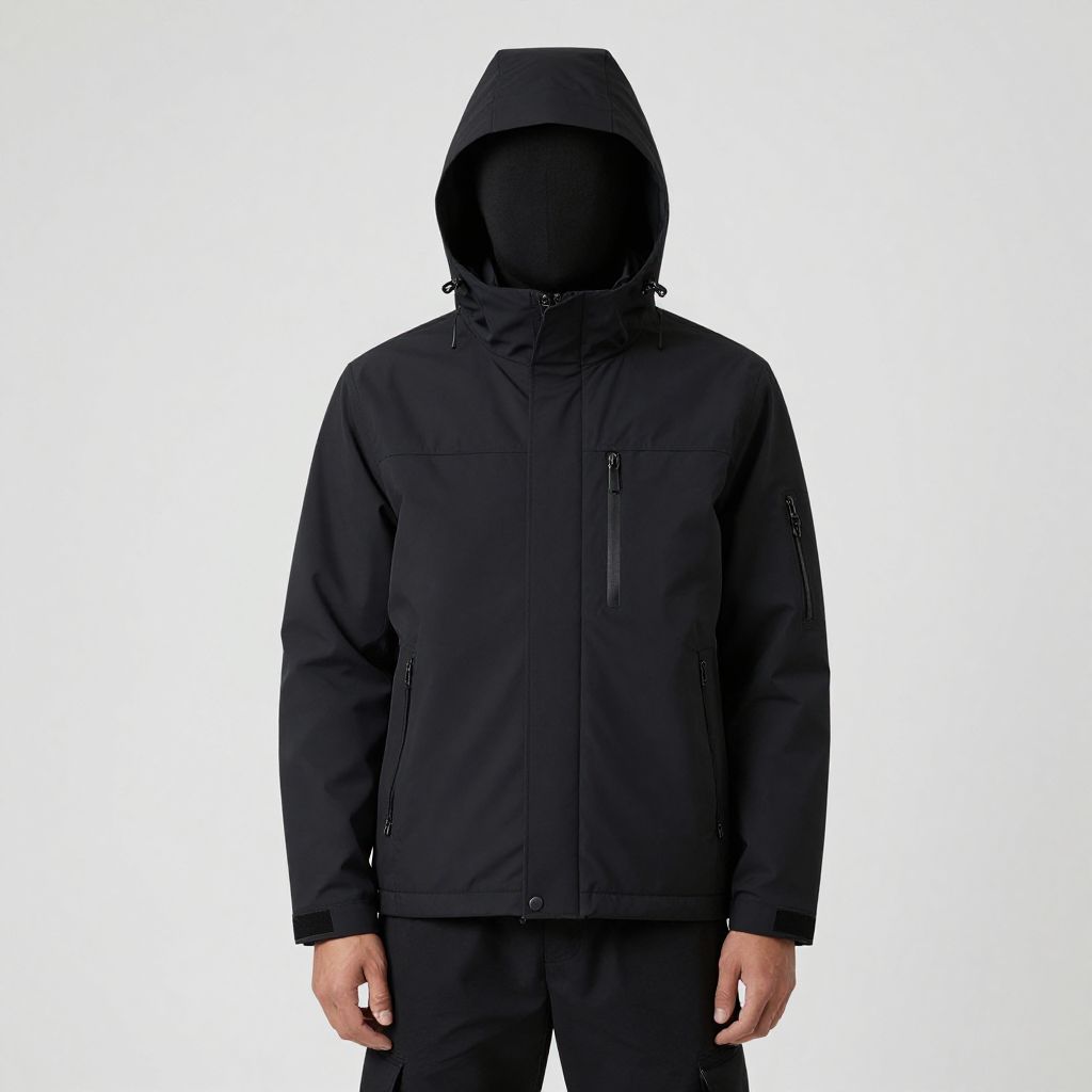 Man wearing a black jacket and black pants with a hood on his head.