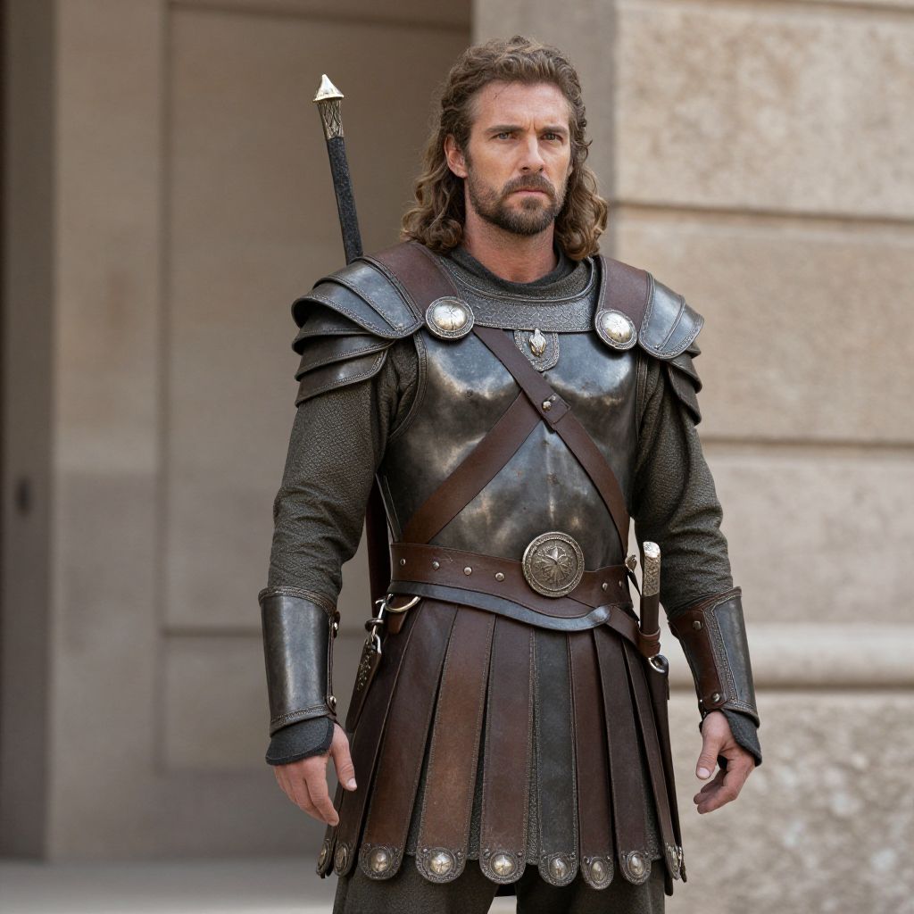 Photograph of a muscular, middle-aged man with long, wavy brown hair and a beard, standing outdoors. He wears ancient-style armor consisting of a black leather chest plate with metallic shoulder guards, a dark mesh shirt, and a brown leather skirt with metallic studs at the bottom edge. A sword with a silver hilt is sheathed on his right shoulder. His expression is serious and determined. The background features a stone building with a beige, textured wall and a partially visible door. The lighting is natural, highlighting the textures of his armor.