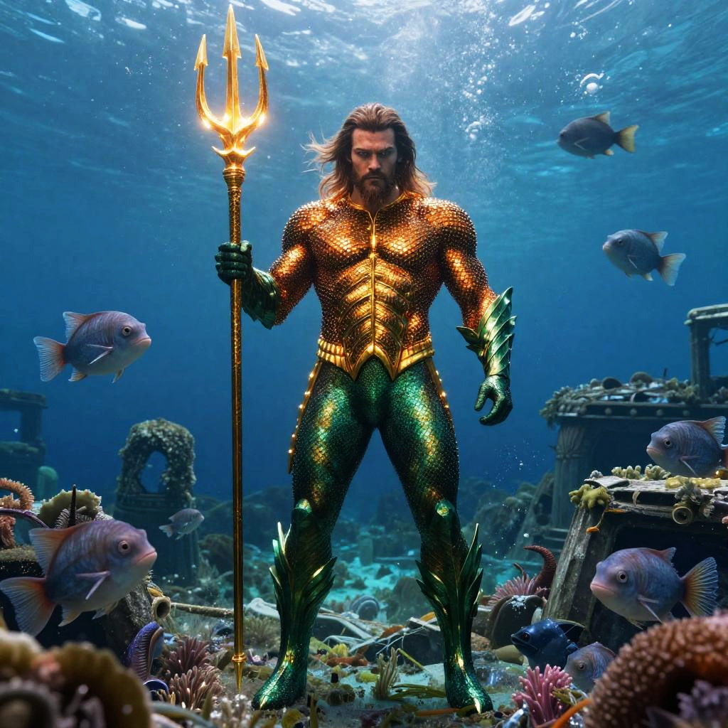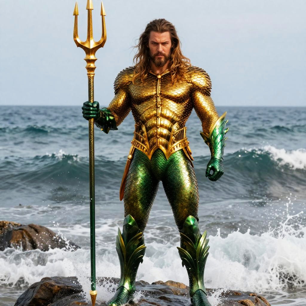 Aquaman full body, standing heroically on a rocky ocean shore, detailed golden armor with green scale patterns, trident in hand, dynamic water effects, cinematic lighting, highly detailed, epic fantasy style