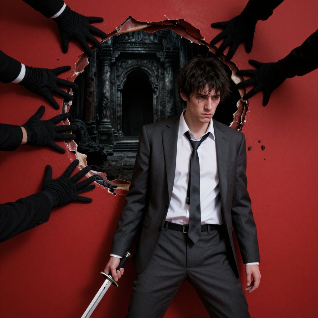 Photograph-style digital artwork of a young Asian man with tousled black hair, wearing a black suit, white shirt, and black tie, standing confidently with a blood-stained sword in his right hand. He faces forward with a serious expression. Behind him is a large, circular, cracked hole revealing a dark, ominous portal with black, outstretched hands emerging from it. The background is a vivid, solid red, enhancing the dramatic and intense atmosphere. The man's suit contrasts sharply with the dark, shadowy portal and menacing hands, creating a sense of tension and confrontation.
