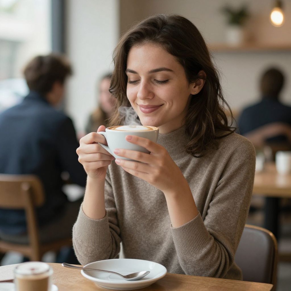 In a softly lit café, a woman cradles a steaming cup of cappuccino, her smile radiating warmth and contentment, as the gentle hum of conversation and the aroma of coffee intertwine, evoking a moment of simple joy and connection.