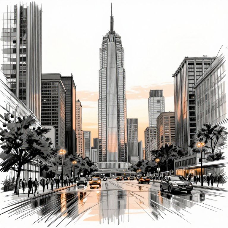 This digital drawing in a comic-style illustration depicts a bustling urban street scene at sunset. Tall skyscrapers with reflective glass windows dominate the background, with the tallest building centrally positioned. The street, glistening with reflections, is lined with palm trees and filled with pedestrians and vehicles. People are dressed in modern, casual attire, while cars, including a prominent white vehicle in the foreground, navigate the wet road. The sky has a gradient of warm orange and white hues, contrasting with the black and white buildings. The overall composition uses bold lines and high contrast, emphasizing the city's dynamic atmosphere.