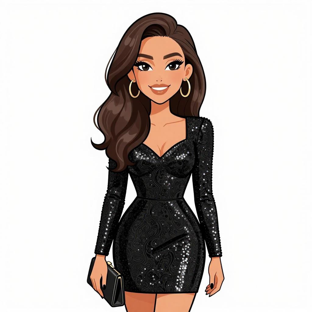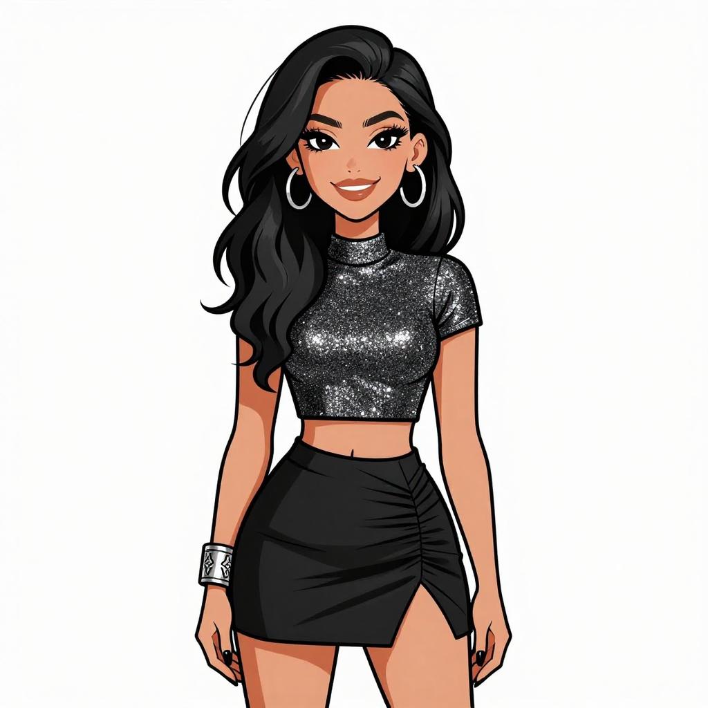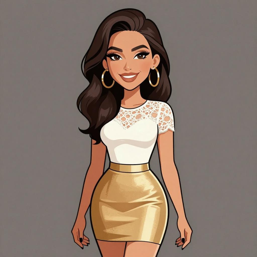Woman with pretty face and pretty hair. smiling Woman, glam rock, sheer black long-sleeved top with lace detailing, metallic gold mini skirt, statement chandelier earrings --sref 1467