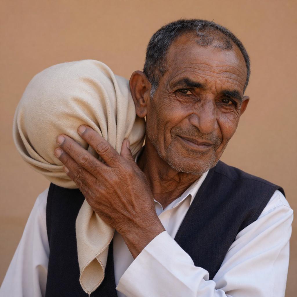 Photograph of an older man with dark hair and tanned skin, smiling slightly while holding a wrapped headscarf against his shoulder. He wears a white shirt and dark vest. The background is a warm, orange-toned blur. The headscarf is beige and ured. The man's expression is gentle and relaxed.