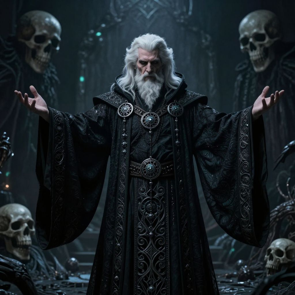 A dark sorcerer standing with arms extended, adorned in elaborate black robes with intricate patterns and large mystical amulets. The sorcerer has white hair and a beard, set against a dark, ominous background featuring skull-like figures and glowing elements, creating a fantasy and supernatural atmosphere.