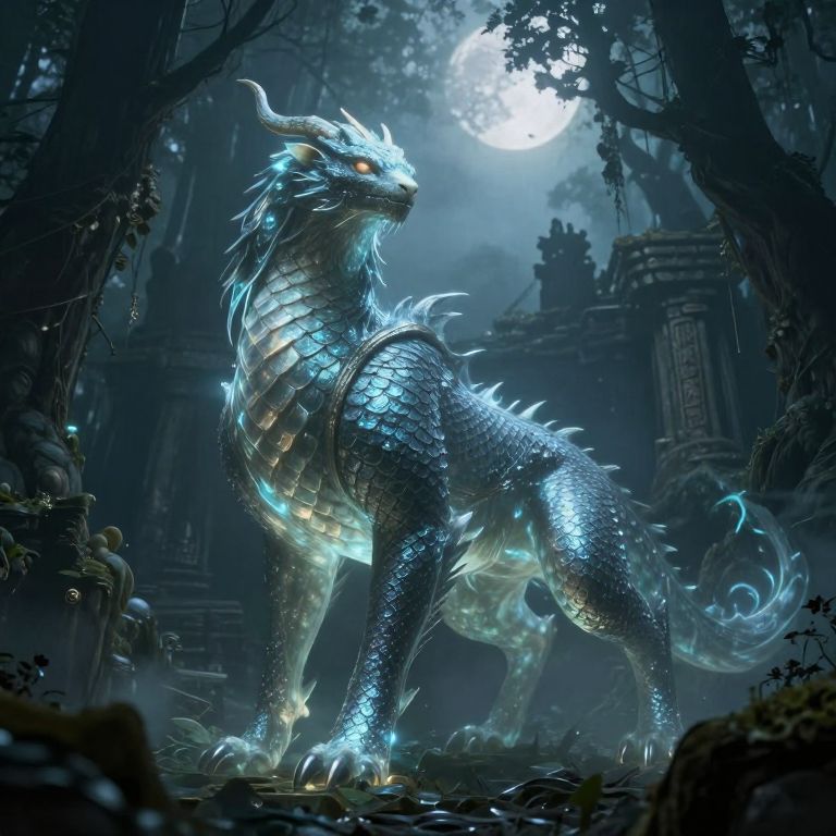 Gomex ancient mythical beast emerging from misty forest, detailed scales shimmering under moonlight, ethereal glow surrounding the creature, fantasy art style, dark and mysterious ambiance with intricate foliage and ancient ruins in background