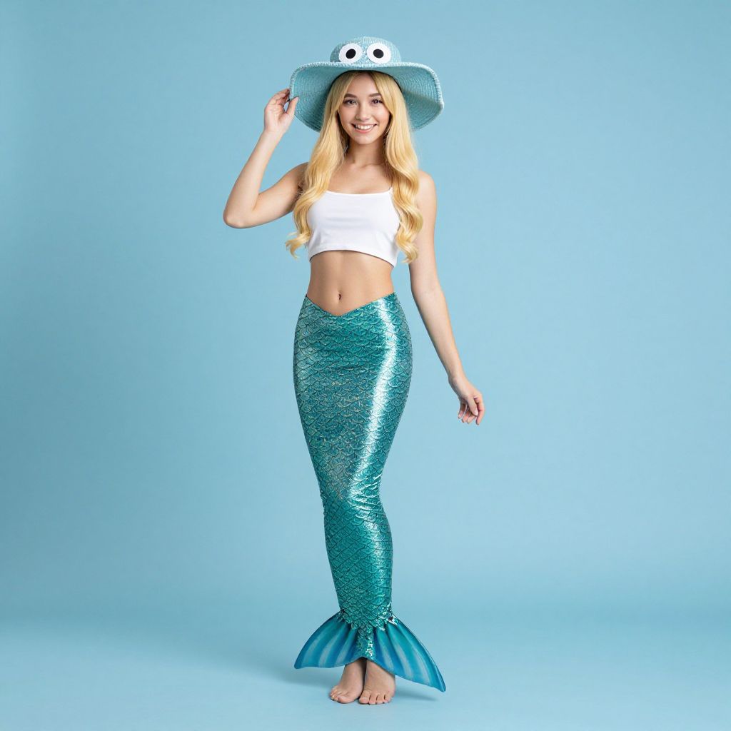 Photograph of a blonde woman with long hair, wearing a white crop top and a shimmering turquoise mermaid tail. She is also sporting a large, floppy blue hat with googly eyes on top. She stands barefoot against a solid light blue background, smiling and touching the brim of her hat with her right hand. Her mermaid tail has a scaled texture and flares out into a fin at the bottom. The image is brightly lit, emphasizing the shiny, metallic texture of her tail and the playful, whimsical costume.
