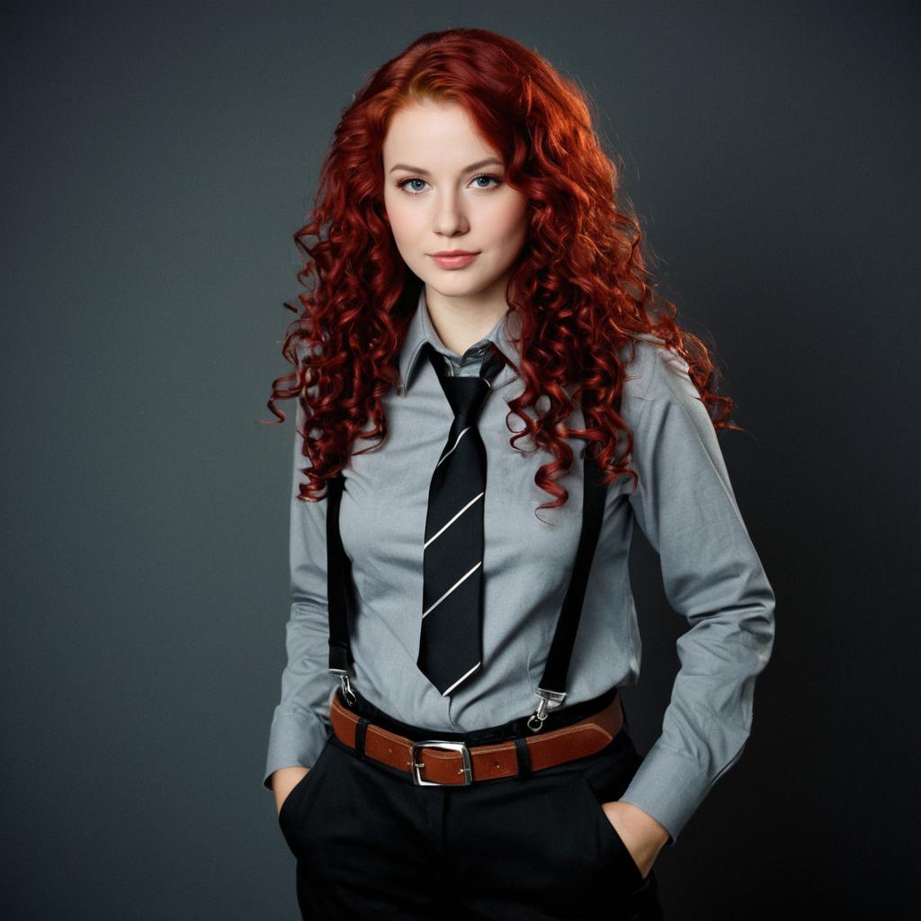 Reno halloween costume,1girl, solo, long hair, red hair, pants, shirt, suspenders, black pants, belt, looking at viewer, necktie, curly hair, closed mouth, long sleeves, black shirt, grey eyes, collared shirt, standing