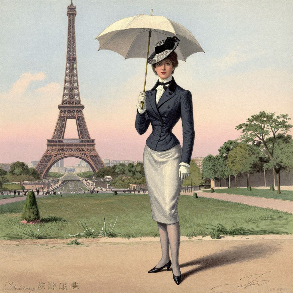 Digital artwork of a poised woman in a navy blazer, white skirt, and black hat, holding a white umbrella, standing in front of the E
