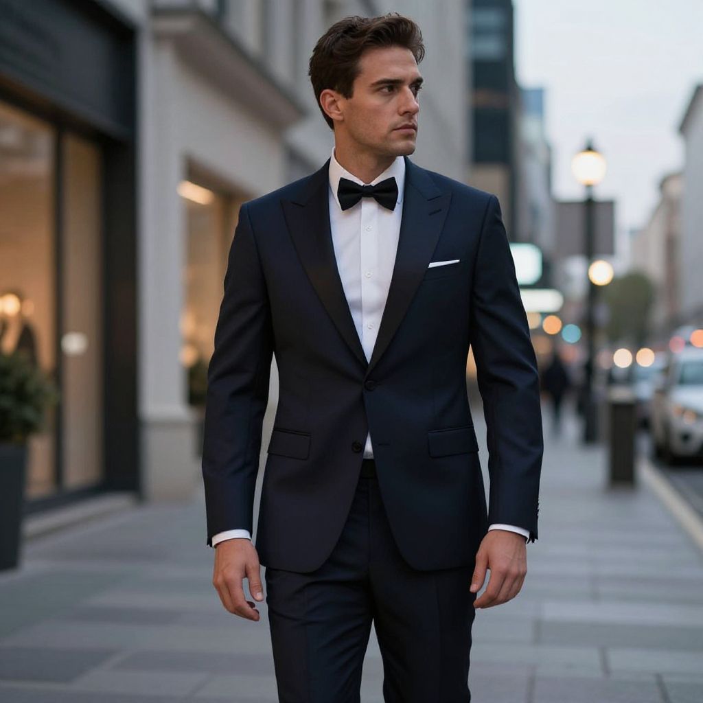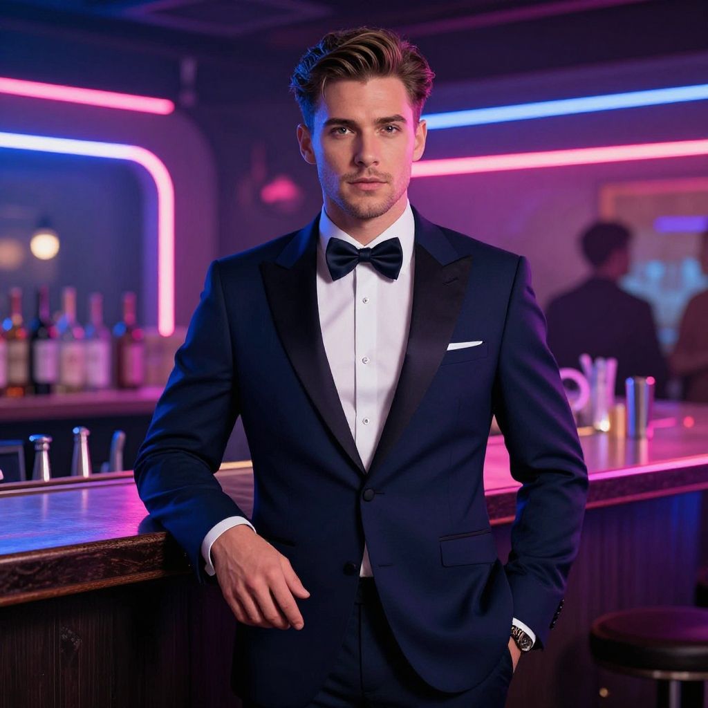 A stylish man stands confidently at a vibrant bar, illuminated by neon lights in shades of blue and pink. Dressed in a sleek tuxedo with a bow tie, he embodies sophistication and charisma, making him the perfect focal point in this lively nightlife setting.