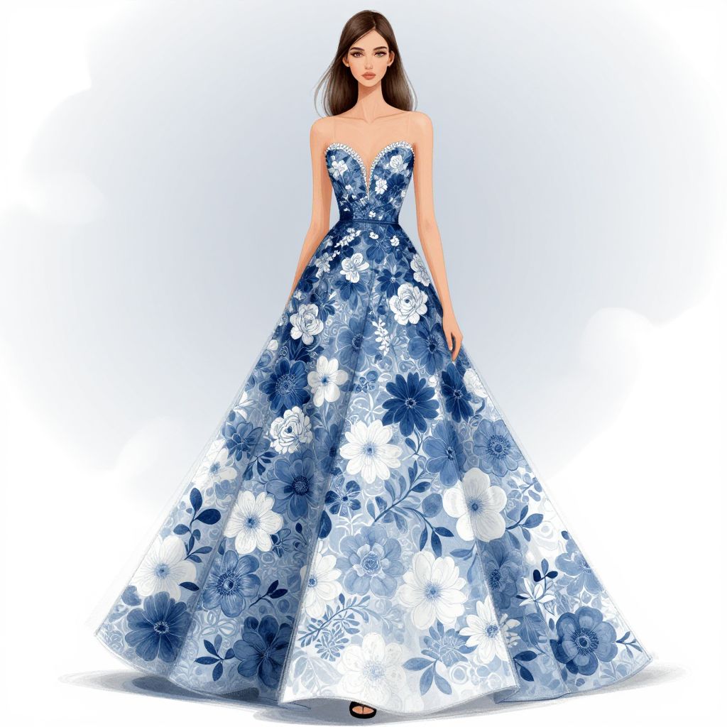 A stunning fashion illustration showcasing a woman in an exquisite floral gown. The dress features intricate blue and white floral patterns, flowing elegantly to the ground. The artwork captures the essence of high fashion with a modern aesthetic.