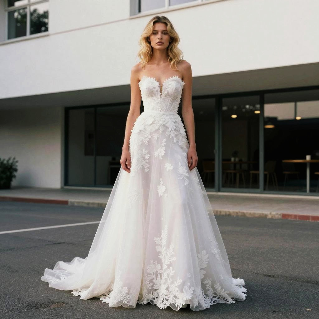 Photograph of a blonde woman with wavy hair, standing on a street in front of a modern building with large windows. She wears a strapless, white, lace wedding gown with a fitted bodice and a full, flowing skirt adorned with floral lace details. The gown has a subtle sheen and a delicate, romantic style. She stands confidently with a neutral expression, her hands resting by her sides. The background includes a gray asphalt street and a white building with dark window frames. The lighting is bright, highlighting the dress's intricate lacework.