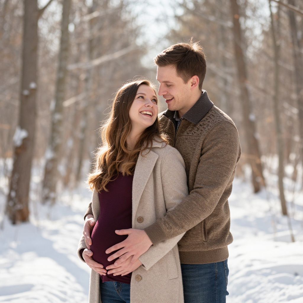 Expectant parents share a tender moment in a snowy forest, with the woman's hand gently resting on her belly while the man embraces her warmly, both smiling joyfully as sunlight filters through the bare trees in the background.