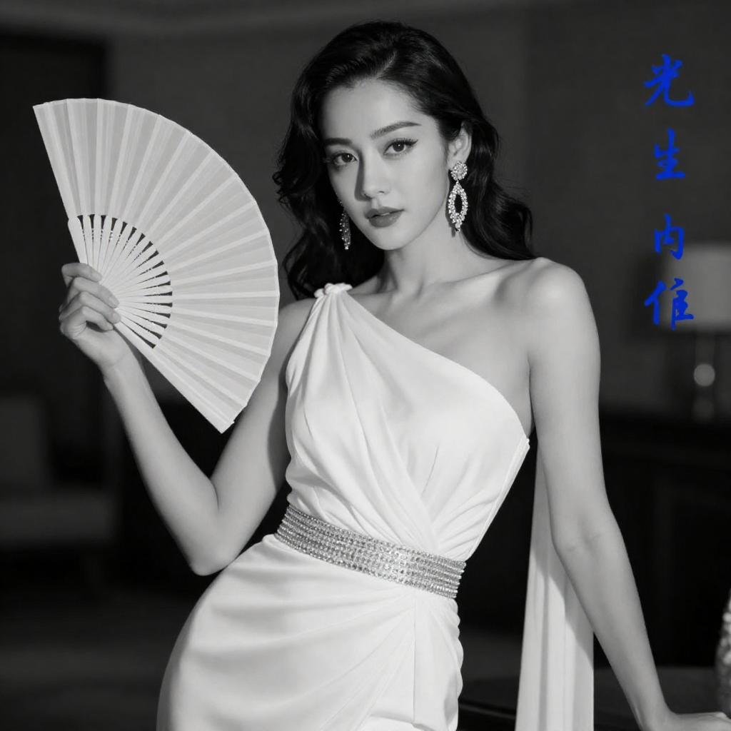 Black-and-white photograph of a glamorous woman with dark, wavy hair and large, dangling earrings. She wears a one-shoulder, white, draped gown with a sparkling, ured waistband. She holds a large, curved fan in her right hand. Her expression is poised and elegant. The background is dark and blurred, emphasizing her figure. A in blue ink is visible on the right side.