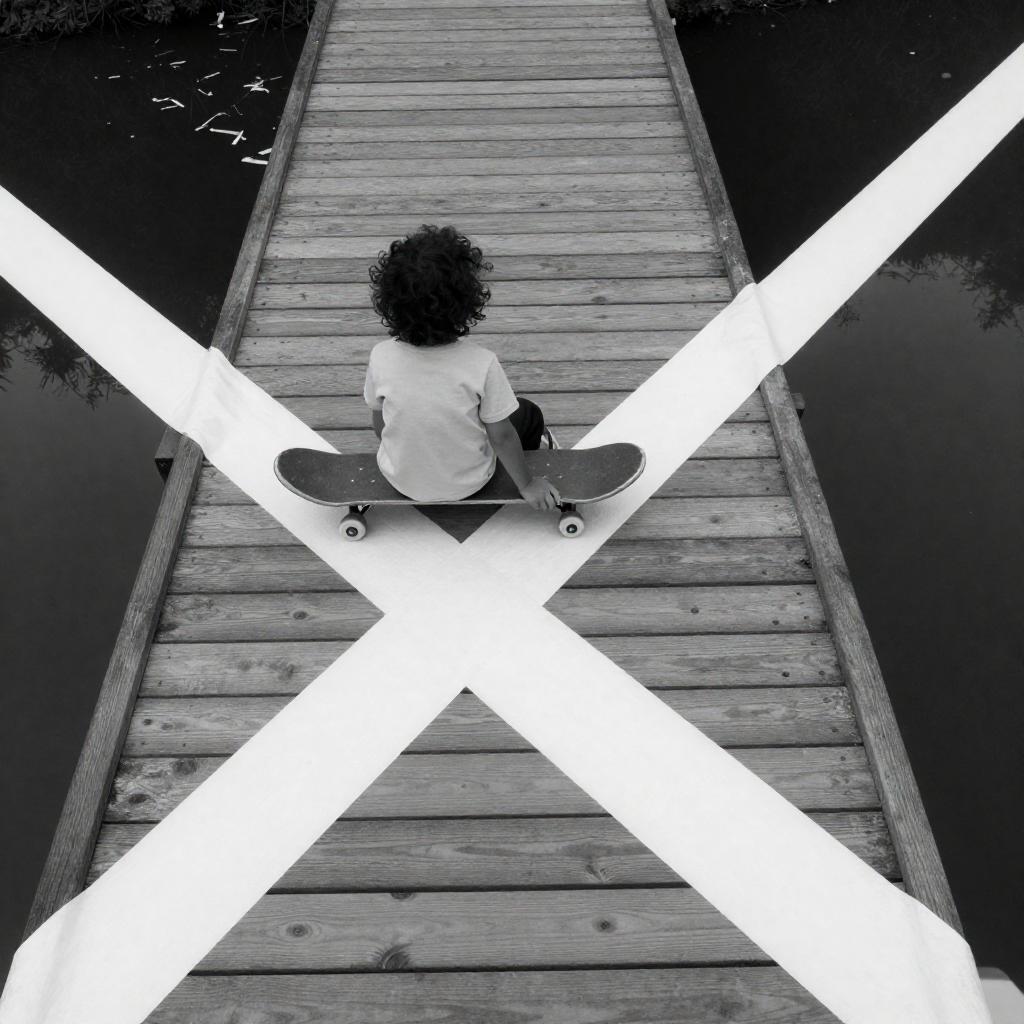 Black-and-white photograph of a child with curly hair sitting on a wooden plank bridge, holding a skateboard. The bridge is intersected by large, white, diagonal tape-like lines. The child wears a light shirt and dark pants. The background includes a ured, dark surface and scattered debris. The image has a high-contrast, abstract style.