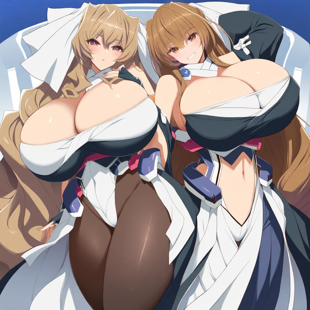 Digital anime-style illustration featuring two mature female characters. One character has short red hair and brown eyes, wearing a tight dark purple fantasy armor revealing large breasts and cleavage. The other character has short brown hair, brown eyes, and light skin, dressed in a black and white maid-like outfit with a blue accessory. Both characters exhibit confident and gentle expressions, with a dark gradient background.
