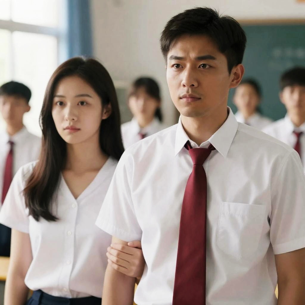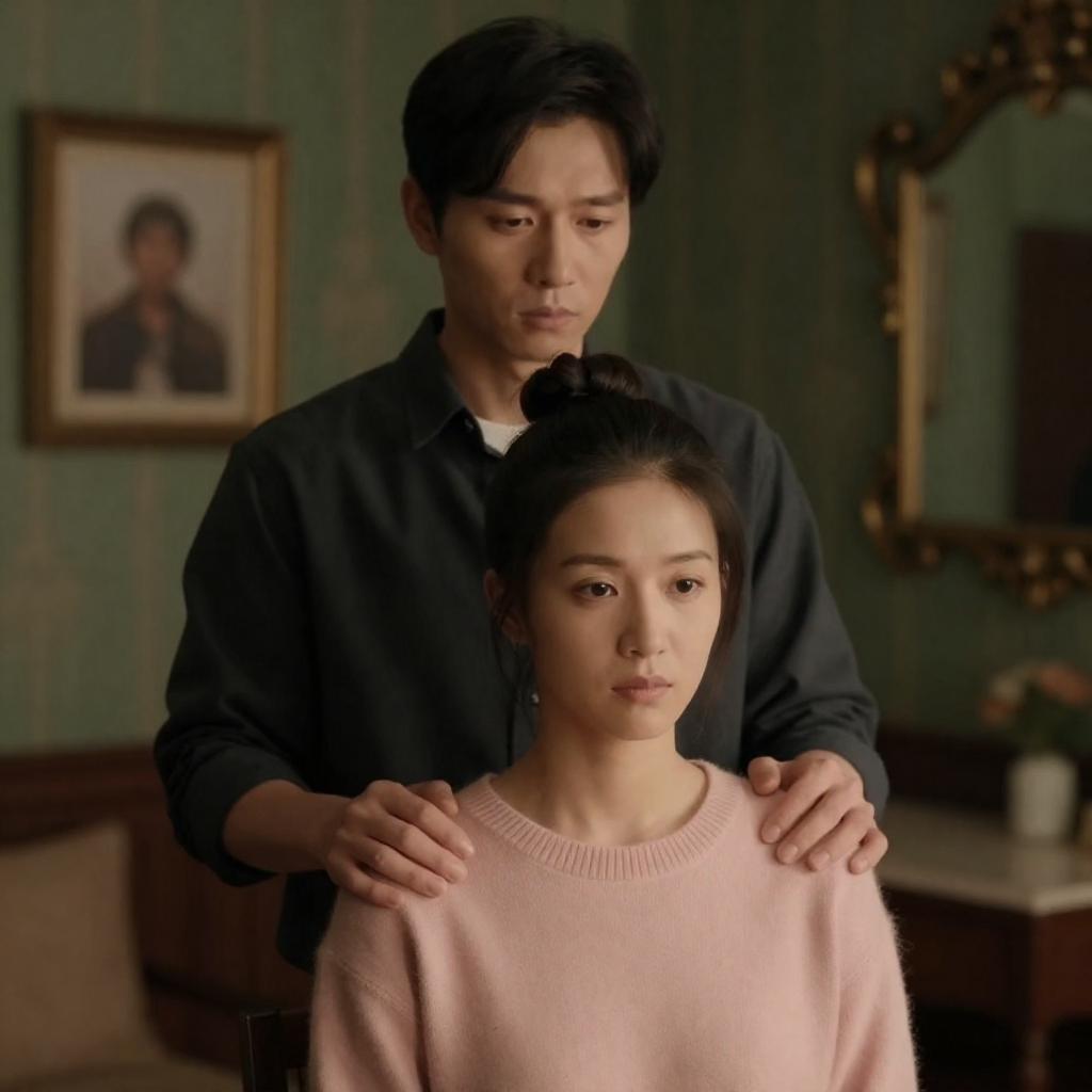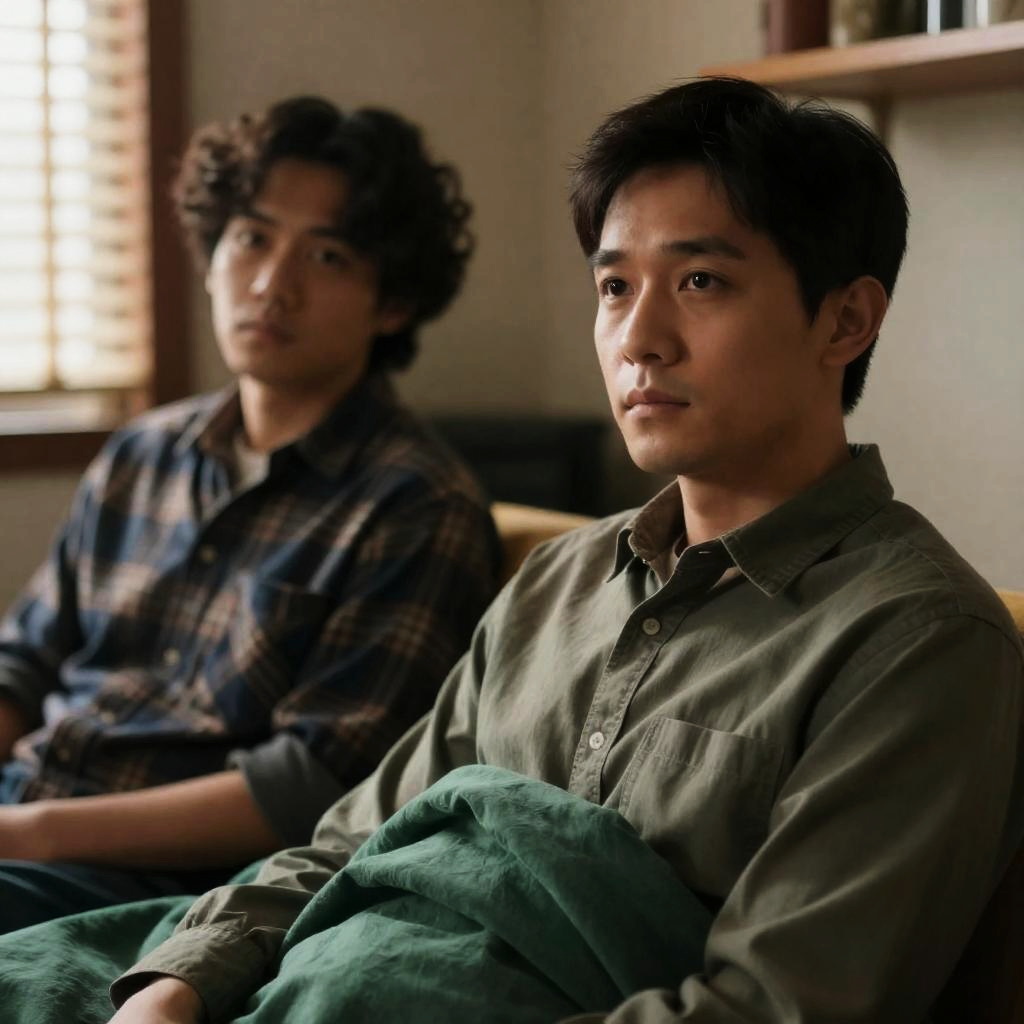 Photograph of four people around a bed. A woman with curly brown hair and light blouse leans over a patient, touching their forehead. Three men in hats and dark clothing stand nearby. Patient lies on bed with plaid blanket. Background shows blurred trees. Woman's expression is concerned, men's expressions are neutral.
