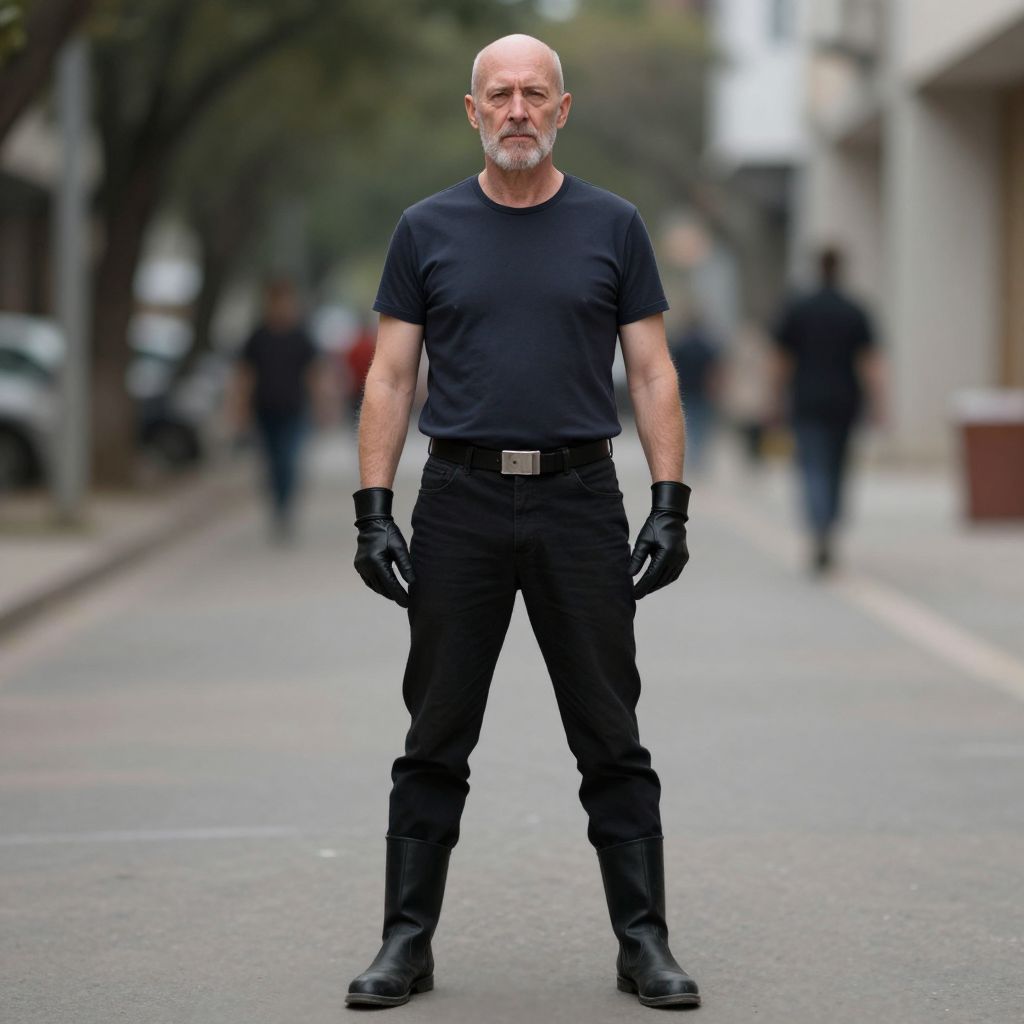 Photograph of a bald, bearded man in black t-shirt, pants, gloves, and boots, standing confidently on a blurred urban street.