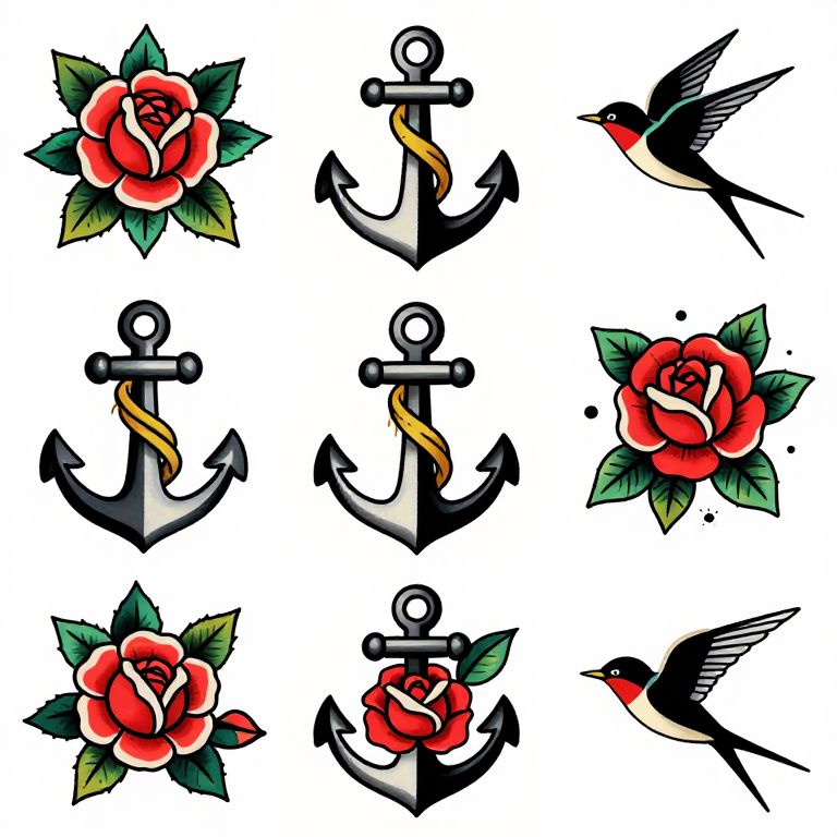 Tattoo pngs illustrating classic Americana style motifs like roses, anchors, and swallows in bright traditional colors, each design rendered on transparent backgrounds with clean outlines and vintage flair.