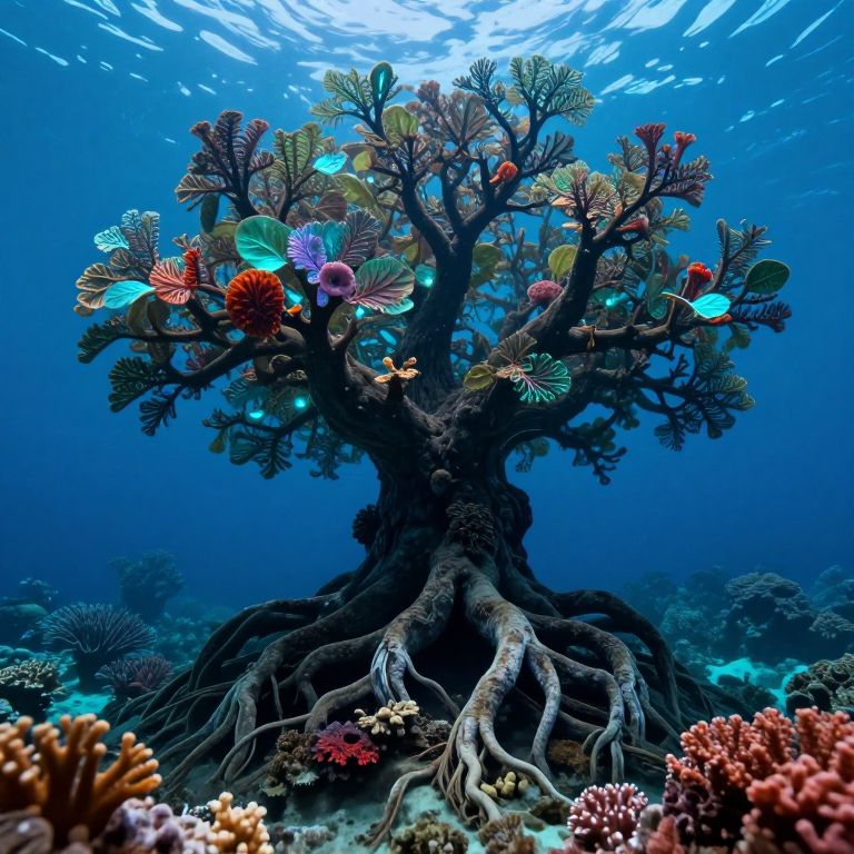 A majestic, otherworldly tree emerges from the ocean floor, its gnarled roots entwined with vibrant coral formations, while its branches reach skyward, adorned with luminous, iridescent leaves that shimmer like living sponges, defying the boundaries between land and sea.