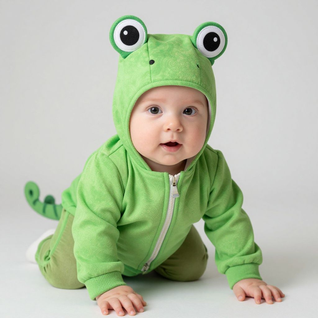 Photograph of a baby with fair skin, wearing a green frog-themed onesie with hood, large eyes, and tail, crawling on a white background