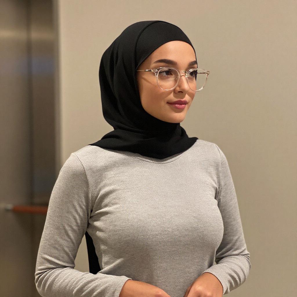Photograph of a young woman with light skin and brown eyes, wearing a black hijab and clear-framed glasses. She has a slender build and is dressed in a light gray, ribbed, long-sleeve top that accentuates her small breasts. She stands indoors, slightly turned to the side, with her hands gently clasped in front of her. The background is softly lit with warm, yellow lighting.