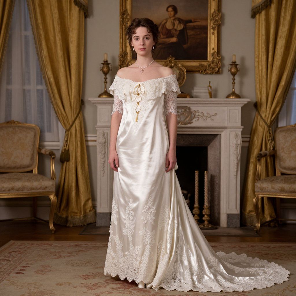 Elegant Regency-style silk gown wedding dress, reminiscent of *Pride and Prejudice*, featuring off-the-shoulder sleeves and intricate lace detailing, is worn by a woman standing gracefully in a grand room adorned with gold curtains, a fireplace, and antique furniture, evoking the charm of Jane Austen's era.