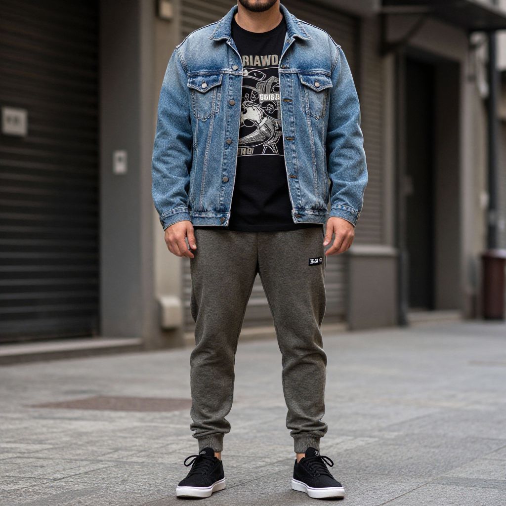Streetwear distressed jeans, european man, with layered look, realistic street photography, faded denim, cityscape background, 30-year-old professional, natural lighting, urban atmosphere
