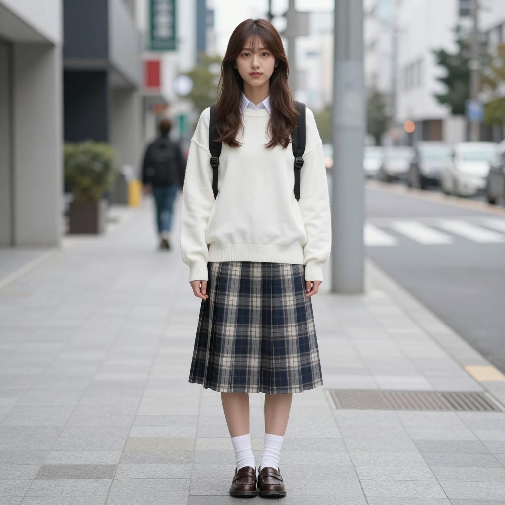 Asian woman with long brown hair sitting on gray stairs. Wearing white sweater, blue pleated skirt, black socks, black loafers. Brown handbag with white strap on her right. Left hand resting on knee, right hand holding handbag strap. Neutral facial expression. Light brown wall on left, metal handrail. Textured stair steps. CKS*JAPAN on lower right.