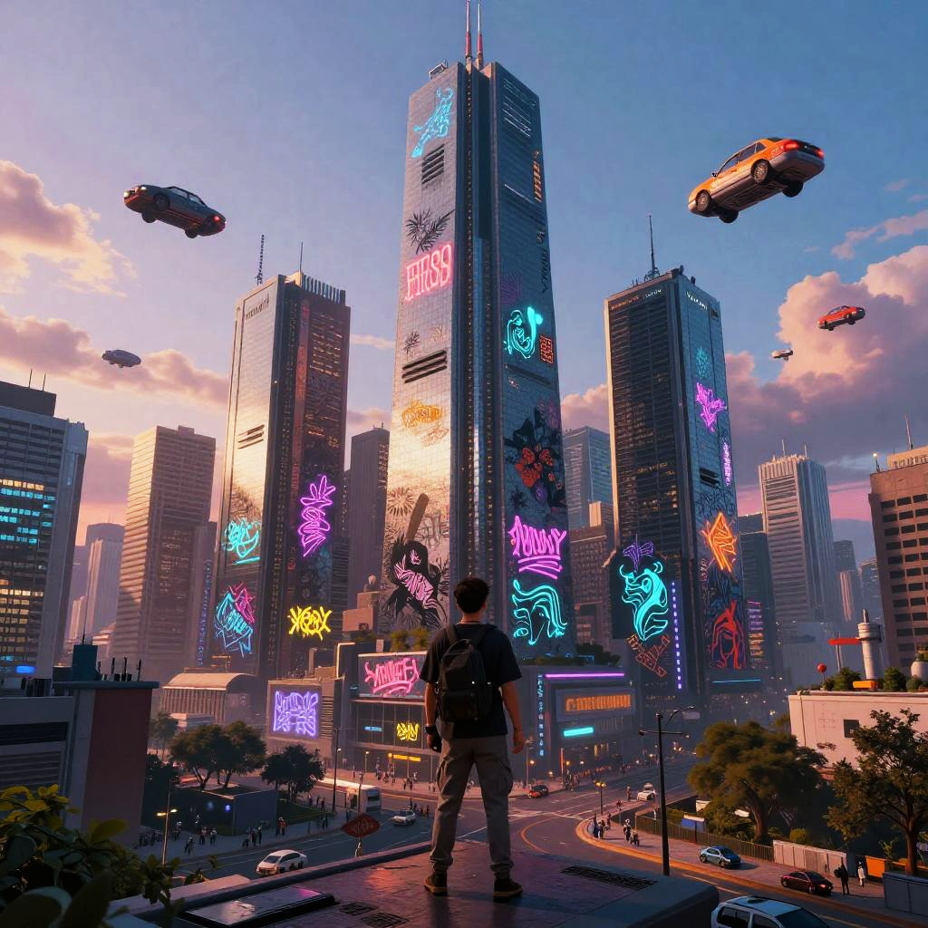 Digital art maker illustrating a futuristic cityscape at dusk, with towering skyscrapers covered in luminous graffiti, flying vehicles, and bustling streets, using bold colors and high contrast shadows to emphasize the energy and innovation of the scene.