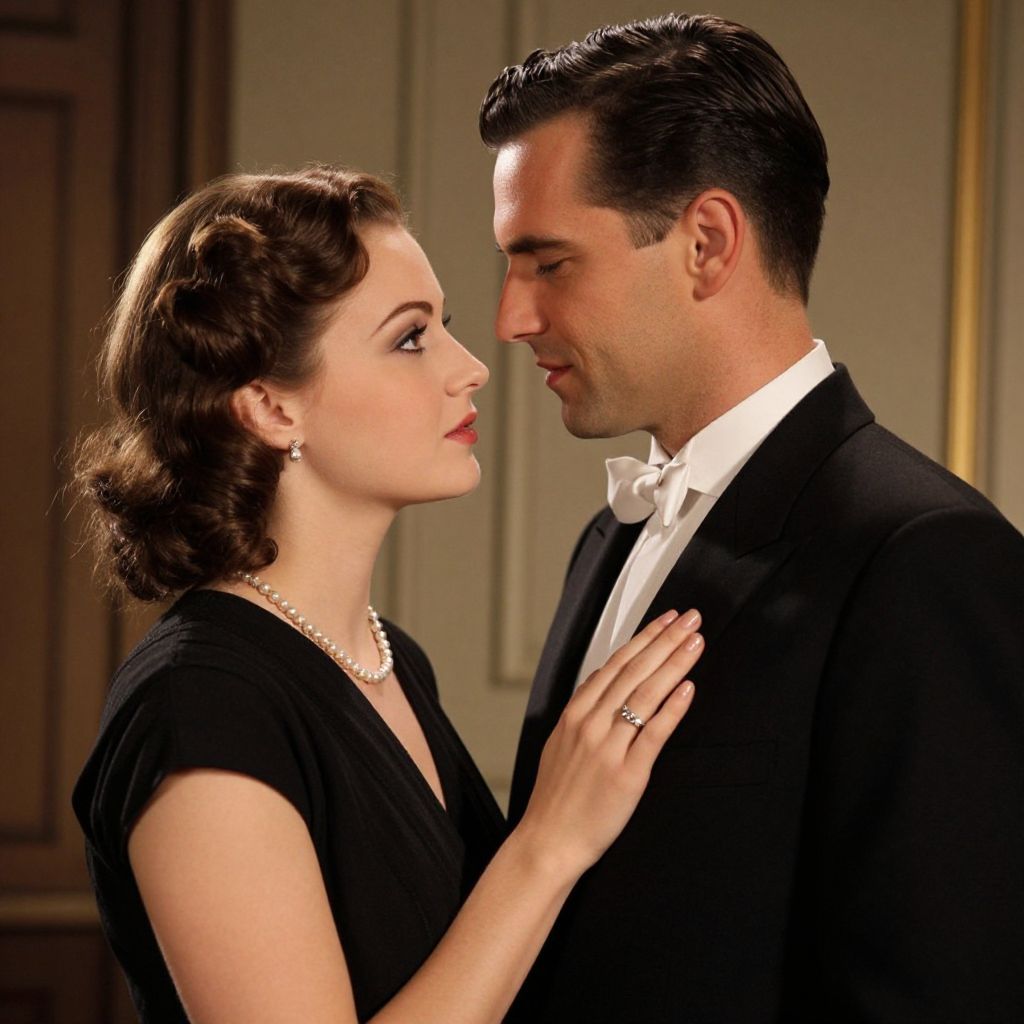 Intimate moment captured between two characters in formal attire, with the woman's hand gently resting on the man's chest, set against a warm, vintage backdrop reminiscent of classic cinema.