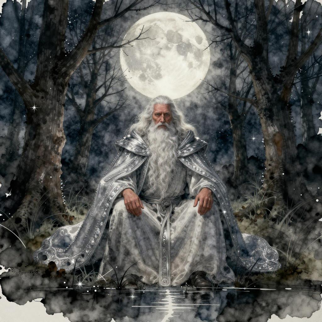 A mystical old man with a long white beard wearing a flowing silver-threaded cloak sits in a dark, moonlit forest surrounded by leafless trees. The scene features a large glowing full moon and sparkling stars, creating a fantasy atmosphere with volumetric watercolor and ink effects, soft airbrushing, and a reflective pool of water at his feet.