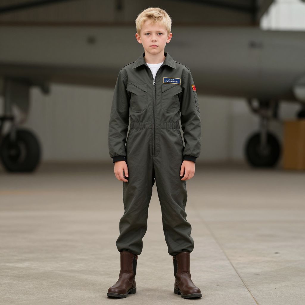 Fighter pilot jumpsuit, 1boy, male focus, solo, standing, blonde hair, boots, pants, full body, jacket, brown footwear, realistic