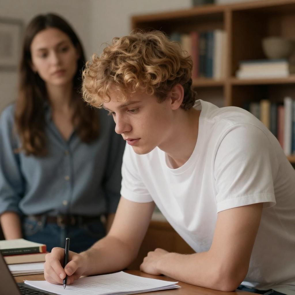 Photograph of a young couple with dark, wavy hair, sitting closely on a wooden surface. The woman in a white blouse writes in a notebook, while the man in a yellow jacket looks intently at her. Warm, brown-toned background.