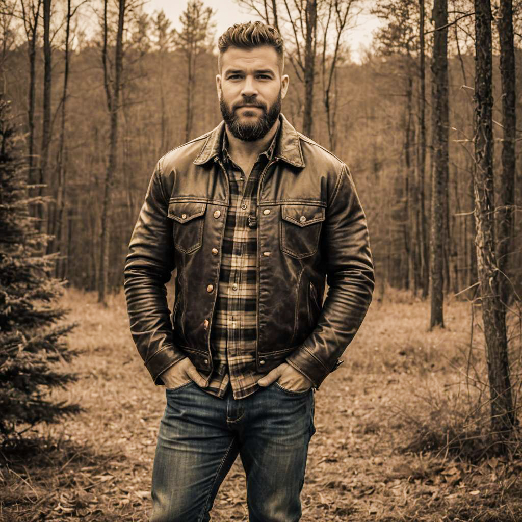 Bearded man, Muscular build, Curly beard, holiday outfit, Leather jacket with a flannel shirt, rugged jeans and boots, vintage sepia tone