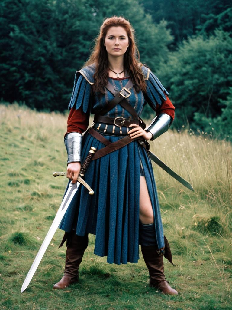 Woman in Braveheart-Inspired Costume, photorealistic outdoor portrait, cinematic realism